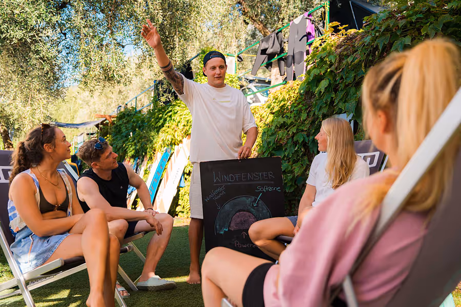Wir treffen uns am ersten Kurstag um 12:00 Uhr am Kitecenter auf dem Gelände von Camping Monja in Brenzone. Zunächst lernen wir uns gegenseitig kennen und erledigen alle nötigen organisatorischen Punkte wie Anmeldung und Bezahlung um einen reibungslosen Ablauf des Kitekurses zu garantieren.
