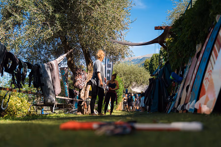 Nach der Session kümmern wir uns um das Material und besprechen den Kursablauf für den nächsten Tag gemeinsam. Da der Tagesablauf von den Wind- und Wetterverhältnissen abhängig ist, kann der Foil Kitekurs am folgenden Tag bereits ab 7:30 Uhr starten. Am Vormittag geht es aufs Wasser, während der Theorieunterricht entspannt im Anschluss an die Session stattfindet. Nach einem Tag auf dem Wasser lassen wir den Abend häufig bei einem gemeinsamen Essen oder gemütlichen BBQ an unserer Kiteschule am Gardasee ausklingen.